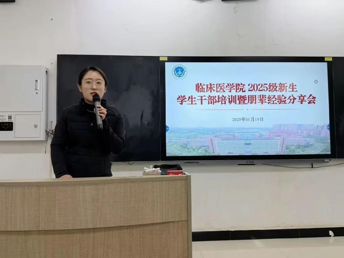 11月19日晚,临床医学院在5207教室举办2025级新生学生干部培训暨朋辈经验交流分享会。院学工办主任兼团委书记李晨紫,年级辅导员胡华莉,以及全体新生学生干部参加分享会。分享会由胡华莉主持。