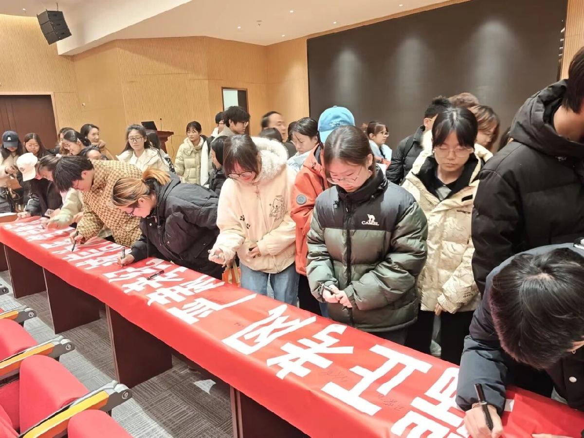 会议中,全体师生一同观看了《国家教育考试考生诚信教育宣传片》,随后在“端正考风,严肃考纪;诚信为医,笃学致远”横幅上签名,以示承诺与决心。
